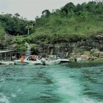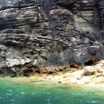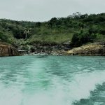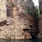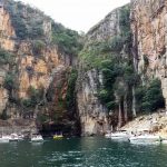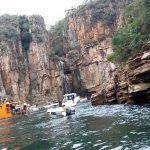 As embarcações param para mergulho e ida até a cachoeira e também para apreciar as incríveis formações rochosas.
